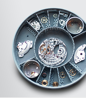 拆解機芯后,各組件以合適的溶液進行超聲波清潔。